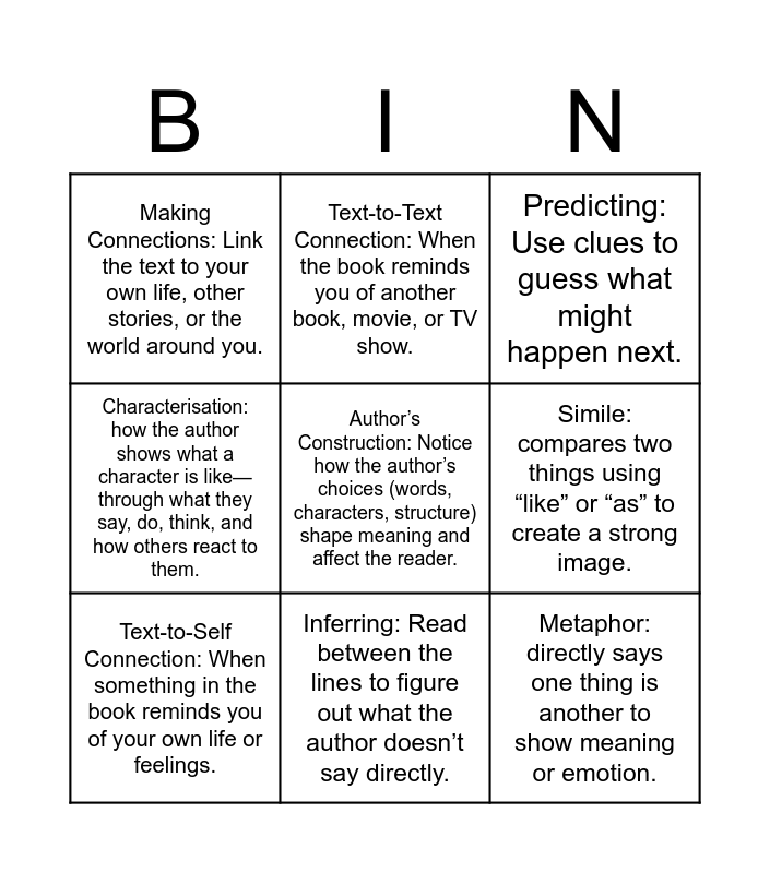 This bingo card has 15 words: Free!, Questioning: Ask who, what, where, when, why or how to better understand the text., Predicting: Use clues to guess what might happen next., Making Connections: Link the text to your own life, other stories, or the world around you., Inferring: Read between the lines to figure out what the author doesn’t say directly., Author’s Construction: Notice how the author’s choices (words, characters, structure) shape meaning and affect the reader., Summarising: Retell the main ideas in a short and clear way., Synthesising: Combine what you've read with your own thinking to create a new understanding., Simile: compares two things using “like” or “as” to create a strong image., Metaphor: directly says one thing is another to show meaning or emotion., Personification: gives human qualities to non-human things., Characterisation: how the author shows what a character is like—through what they say, do, think, and how others react to them., Text-to-Self Connection: When something in the book reminds you of your own life or feelings., Text-to-Text Connection: When the book reminds you of another book, movie, or TV show. and Text-to-World Connection: When the story reminds you of something happening in the real world—like a news story or global issue..