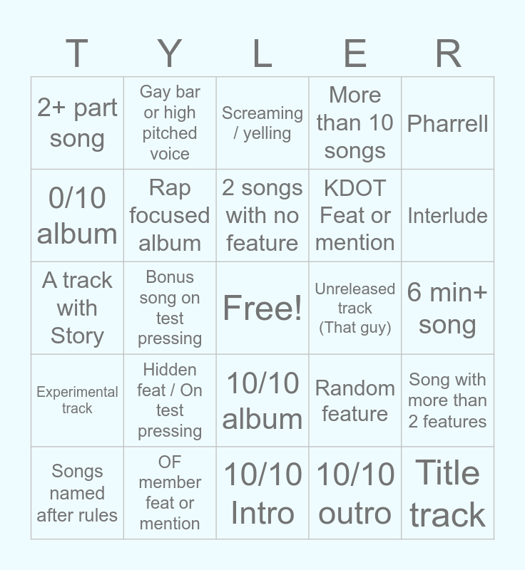 This bingo card has a free space and 24 words: Hidden feat / On test pressing, OF member feat or mention, 2 songs with no feature, Songs named after rules, Pharrell, 2+ part song, 0/10 album, Gay bar or high pitched voice, Unreleased track (That guy), 10/10 album, KDOT Feat or mention, A track with Story, Random feature, Song with more than 2 features, Rap focused album, 10/10 outro, 6 min+ song, Screaming / yelling, Interlude, Bonus song on test pressing, Title track, Experimental track, More than 10 songs and 10/10 Intro.