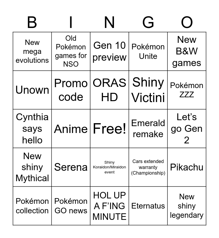 This bingo card has a free space and 24 words: Serena, Pokémon GO news, ORAS HD, Pokémon collection, New B&W games, New mega evolutions, Unown, Old Pokémon games for NSO, Emerald remake, Shiny Koraidon/Miraidon event, Shiny Victini, Cynthia says hello, Cars extended warranty (Championship), Pikachu, Promo code, Eternatus, Let’s go Gen 2, Gen 10 preview, Pokémon ZZZ, Anime, New shiny legendary, New shiny Mythical, Pokémon Unite and HOL UP A F’ING MINUTE.