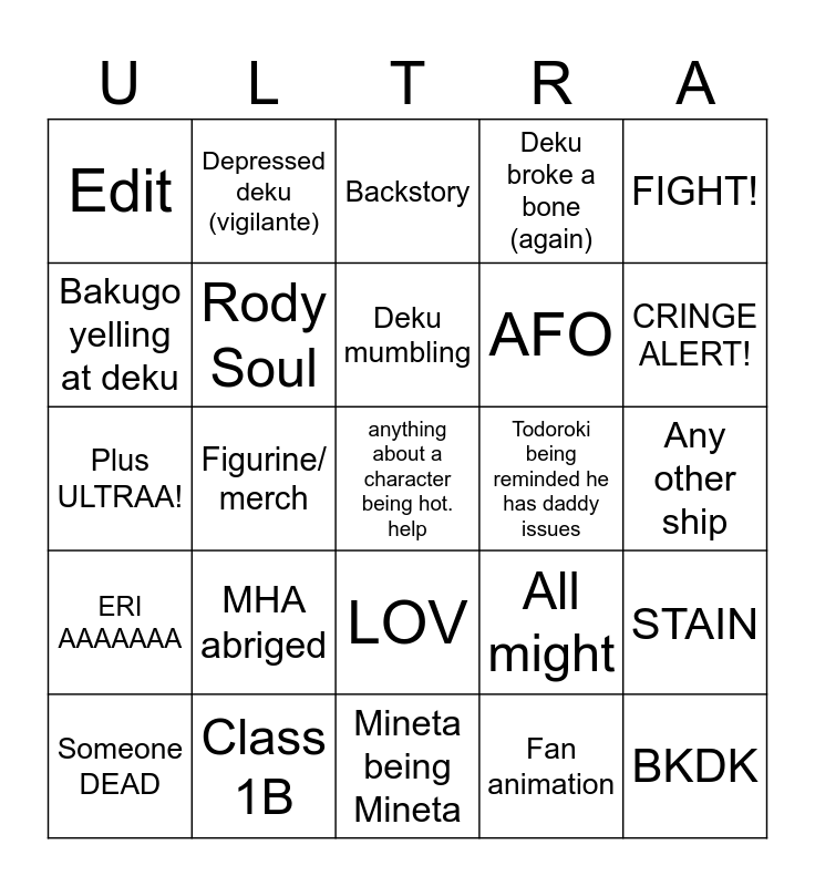 This bingo card has 25 words: MHA abriged, Mineta being Mineta, Deku mumbling, Someone DEAD, FIGHT!, Edit, Bakugo yelling at deku, Depressed deku (vigilante), Todoroki being reminded he has daddy issues, LOV, AFO, Plus ULTRAA!, All might, STAIN, Rody Soul, BKDK, Any other ship, Backstory, CRINGE ALERT!, Figurine/ merch, anything about a character being hot. help, Class 1B, ERI AAAAAAA, Deku broke a bone (again) and Fan animation.