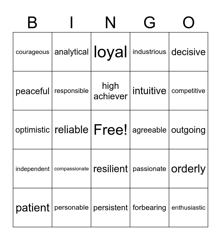 This bingo card has a free space and 29 words: patient, empathetic, reliable, rational, courageous, loyal, responsible, compassionate, agreeable, personable, outgoing, enthusiastic, persistent, forbearing, competitive, efficient, resilient, independent, decisive, optimistic, passionate, dependable, intuitive, peaceful, industrious, analytical, orderly, high achiever and consistent.