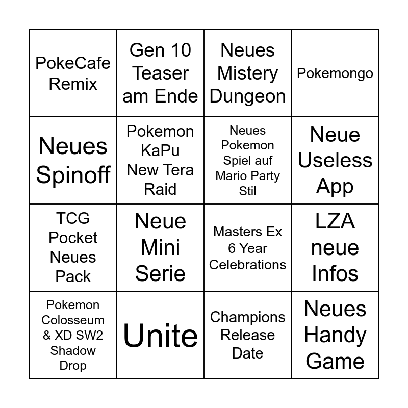 This bingo card has 16 words: Unite, LZA neue Infos, Neues Mistery Dungeon, PokeCafe Remix, TCG Pocket Neues Pack, Gen 10 Teaser am Ende, Masters Ex 6 Year Celebrations, Champions Release Date, Neues Spinoff, Pokemon KaPu New Tera Raid, Pokemon Colosseum & XD SW2 Shadow Drop, Pokemongo, Neue Mini Serie, Neue Useless App, Neues Pokemon Spiel auf Mario Party Stil and Neues Handy Game.