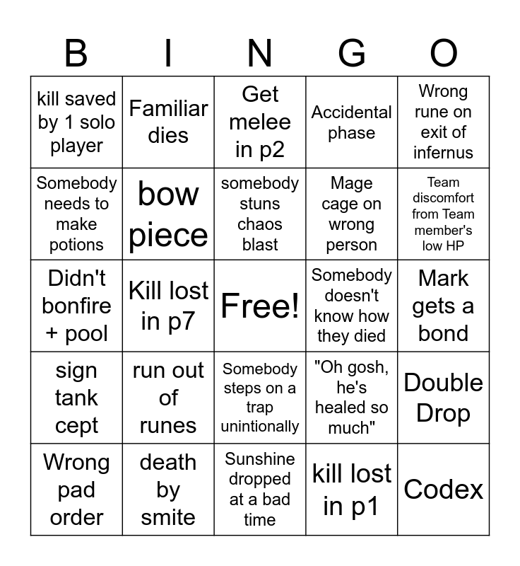 This bingo card has a free space and 46 words: "This world will Burn!" - I'm dead, Codex, Somebody needed to buy supplies, Sunshine dropped at a bad time, run out of runes, somebody gets flamed in voice, Familiar dies, Somebody begs for food, Somebody needs to make potions, vestment piece, bow piece, Accidental phase, Double Drop, "Oh gosh, he's healed so much", Demon escaping infernus, missed stun, somebody stuns chaos blast, Somebody doesn't know how they died, Rune Double Killed, Wrong rune on exit of infernus, Kill lost in p7, kill lost in p1, kill saved by 1 solo player, Mage cage on wrong person, Sudden death by auto, Team discomfort from Team member's low HP, Wrong pad order, Wrong mechanic called in voice confidentally, Somebody steps on a trap unintionally, sign tank cept, somebody dies to ring, Death to "smoke bomb", "Soulfire! I just Soulfired", Ability bar not setup for zam, Hop worlds to protect player membership, death by smite, Mark gets a bond, pad 4 repeat, pad 5 repeat, 4+ kph, < 11 min kill, Get melee in p2, Didn't bonfire + pool, familiar not on passive, everyone survives and rage quit to other content.