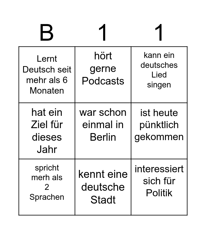 This bingo card has a free space and 8 words: ist heute pünktlich gekommen, kann ein deutsches Lied singen, hört gerne Podcasts, spricht merh als 2 Sprachen, Lernt Deutsch seit mehr als 6 Monaten, interessiert sich für Politik, hat ein Ziel für dieses Jahr and kennt eine deutsche Stadt.
