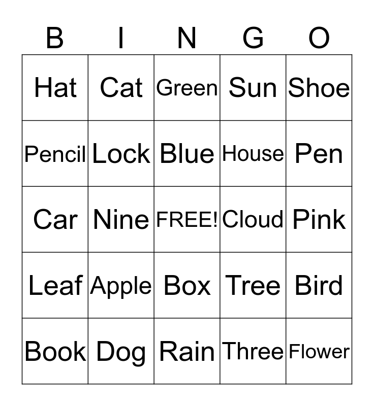 This bingo card has a free space and 24 words: Apple, Dog, Blue, Book, Shoe, Hat, Pencil, Cat, Cloud, Box, House, Car, Tree, Bird, Lock, Three, Pink, Green, Pen, Nine, Flower, Leaf, Sun and Rain.