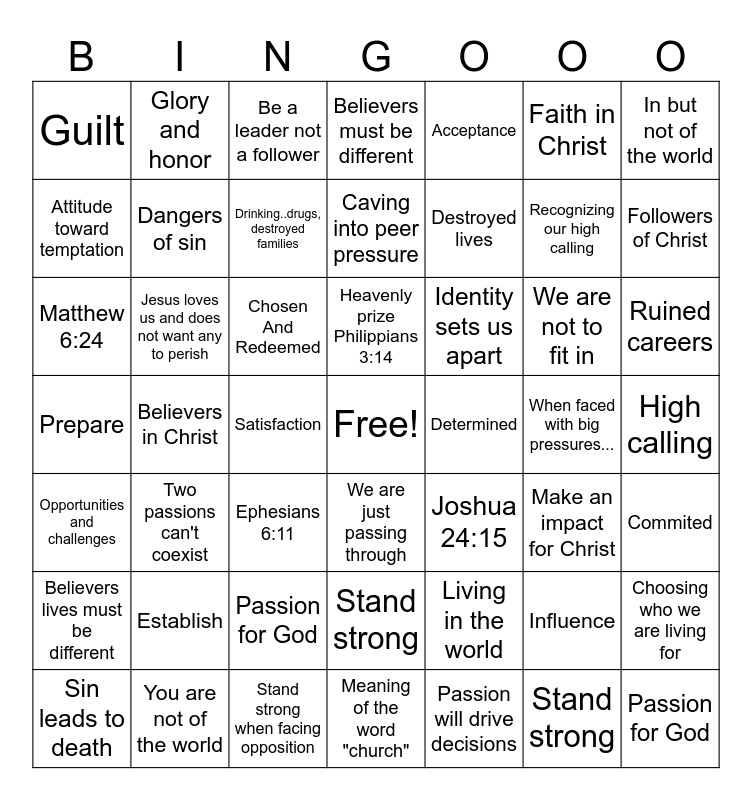 This bingo card has a free space and 48 words: Living in the world, Recognizing our high calling, Meaning of the word "church", Believers in Christ, Chosen And Redeemed, High calling, Glory and honor, You are not of the world, Faith in Christ, We are just passing through, In but not of the world, Believers must be different, We are not to fit in, Identity sets us apart, Believers lives must be different, When faced with big pressures..., Attitude toward temptation, Followers of Christ, Influence, Acceptance, Destroyed lives, Satisfaction, Guilt, Dangers of sin, Choosing who we are living for, Drinking..drugs, destroyed families, Ruined careers, Sin leads to death, Heavenly prize Philippians 3:14, Jesus loves us and does not want any to perish, Stand strong, Determined, Commited, Establish, Prepare, Joshua 24:15, Make an impact for Christ, Matthew 6:24, Ephesians 6:11, Passion for God, Opportunities and challenges, Passion for God, Be a leader not a follower, Stand strong when facing opposition, Caving into peer pressure, Stand strong, Two passions can't coexist and Passion will drive decisions.