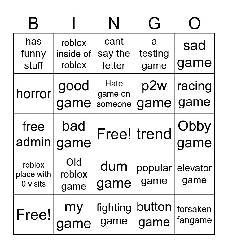 This bingo card has a free space and 24 words: Old roblox game, my game, Hate game on someone, Free!, sad game, has funny stuff, horror, roblox inside of roblox, trend, dum game, p2w game, free admin, popular game, elevator game, good game, button game, Obby game, cant say the letter, racing game, bad game, forsaken fangame, roblox place with 0 visits, a testing game and fighting game.