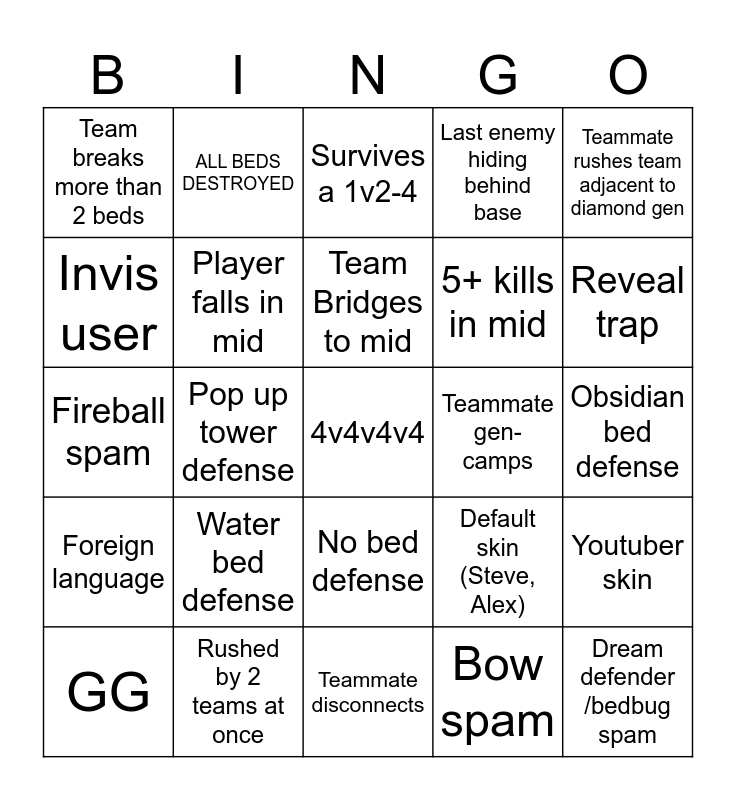 This bingo card has a free space and 24 words: Water bed defense, Rushed by 2 teams at once, Team Bridges to mid, GG, Teammate rushes team adjacent to diamond gen, Team breaks more than 2 beds, Invis user, ALL BEDS DESTROYED, Teammate gen-camps, No bed defense, 5+ kills in mid, Fireball spam, Default skin (Steve, Alex), Youtuber skin, Player falls in mid, Bow spam, Obsidian bed defense, Survives a 1v2-4, Reveal trap, Pop up tower defense, Dream defender /bedbug spam, Foreign language, Last enemy hiding behind base and Teammate disconnects.