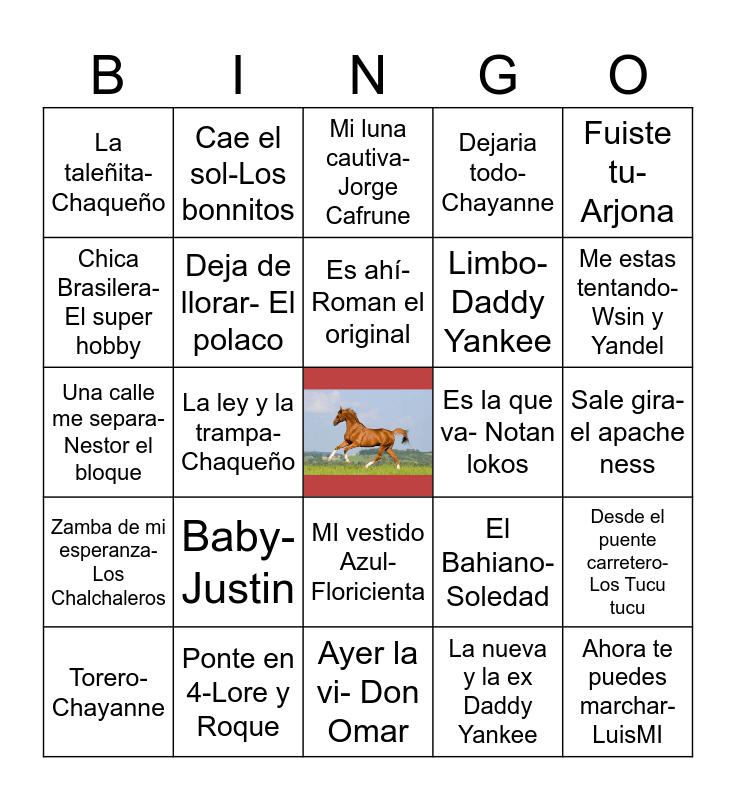 This bingo card has a free space and 50 words: Ahí Ahí- Negro tecla, Ahora te puedes marchar- LuisMI, Ai se eu te pego- Michel Telo, Ayer la vi- Don Omar, Baby- Justin, Brindis- Soledad, Cae el sol-Los bonnitos, Candy- Plan B, Chica Brasilera- El super hobby, Dame un kiss- Los superdiscotecas, Deja de llorar- El polaco, Dejaria todo- Chayanne, Desde el puente carretero- Los Tucu tucu, El Bahiano- Soledad, El tajo y la tanga-Nene malo, A esa- Pimpinela, Es ahí-Roman el original, Es la que va- Notan lokos, Eterno amor-Jorge Rojas, Fuiste tu- Arjona, La ley y la trampa-Chaqueño, La nueva y la ex Daddy Yankee, La taleñita- Chaqueño, Limbo- Daddy Yankee, Lloviendo estrellas- Cristian Castro, Luna Tucumana- Mercedes Sosa+, Me estas tentando- Wsin y Yandel, Me rehuso- Danny Ocean, Mi luna cautiva- Jorge Cafrune, MI vestido Azul- Floricienta, Mueve la carnasa- Maldito peke, Mueve el cucuta- el apache ness, Mueve el toto- El apacheness, Playa-tu papa, Ponte en 4-Lore y Roque, Propuesta Indecente- Romeo, Puti Short-De la calle, quien se ha tomado todo el vino- La mona+, Rosas- La Oreja de Van gogh, Sale gira-el apache ness, su florcita- agrupacion marilyn, te amo- Makano, Te pintaron pajaritos- Yandar y yostin, Terremoto pa tu cola- El apache ness, Torero- Chayanne, Una calle me separa- Nestor el bloque, Una vaina loca-Fuego, Una wacha piola-De la calle, Zamba de mi esperanza- Los Chalchaleros and Guapas- Bandanas.