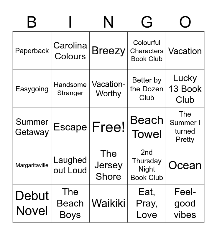 This bingo card has a free space and 77 words: Beach Read, Romance, Breezy, Page-Turner, Elin Hilderbrand, 5-Star Weekend, The Last Thing He Told Me, Escapist, Charming, Relaxing on the Beach, Sun-Soaked, Nantucket, Vacation-Worthy, Easygoing, Pool-side, Escape, Sunkissed Stories, Feel-good vibes, Splash of Drama, Vacation, Beach Bag, Summer Getaway, Handsome Stranger, Carolina Colours, Colourful Characters Book Club, A Novel Idea Book Club, Fiction Addiction, Original Book Club, Tuesday Therapy Book Club, Men's Book Club, Read Between the Wines Club, Well Read Book Club, Read a Little, Wine alot, 2nd Thursday Night Book Club, Lucky 13 Book Club, Better by the Dozen Club, Liane Moriarty, Flirty, The Summer I turned Pretty, Eat, Pray, Love, Page-turner, Bittersweet, Historical Fiction, The Outer Banks, Book set in Paris, Book set at the Beach, Debut Novel, Paperback, Library, Kindle, Sad this book ended, The Jersey Shore, Female Author, Book is Now a Movie, The Book was Better, New Release, Just One More Chapter, Title, Emerald Isle, Biography, Laughed out Loud, Rainy Day & a Book: Perfect, Trilogy, Tear Jerker, Flawed Main Character, Cheeseburger in Paradise, Flip Flops, Beach Towel, Sea Shells, Snorkel, Waves, Ocean, Margaritaville, The Beach Boys, Nights in Rodanthe, Waikiki and Myrtle Beach.
