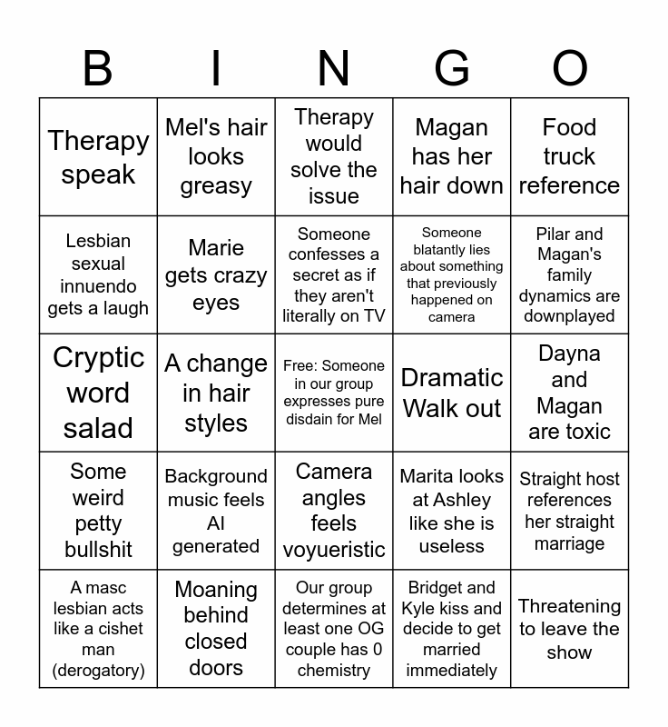 This bingo card has a free space and 24 words: Background music feels AI generated, Moaning behind closed doors, Someone confesses a secret as if they aren't literally on TV, A masc lesbian acts like a cishet man (derogatory), Food truck reference, Therapy speak, Lesbian sexual innuendo gets a laugh, Mel's hair looks greasy, Dramatic Walk out, Camera angles feels voyueristic, Someone blatantly lies about something that previously happened on camera, Cryptic word salad, Marita looks at Ashley like she is useless, Straight host references her straight marriage, Marie gets crazy eyes, Bridget and Kyle kiss and decide to get married immediately, Dayna and Magan are toxic, Therapy would solve the issue, Pilar and Magan's family dynamics are downplayed, A change in hair styles, Threatening to leave the show, Some weird petty bullshit, Magan has her hair down and Our group determines at least one OG couple has 0 chemistry.
