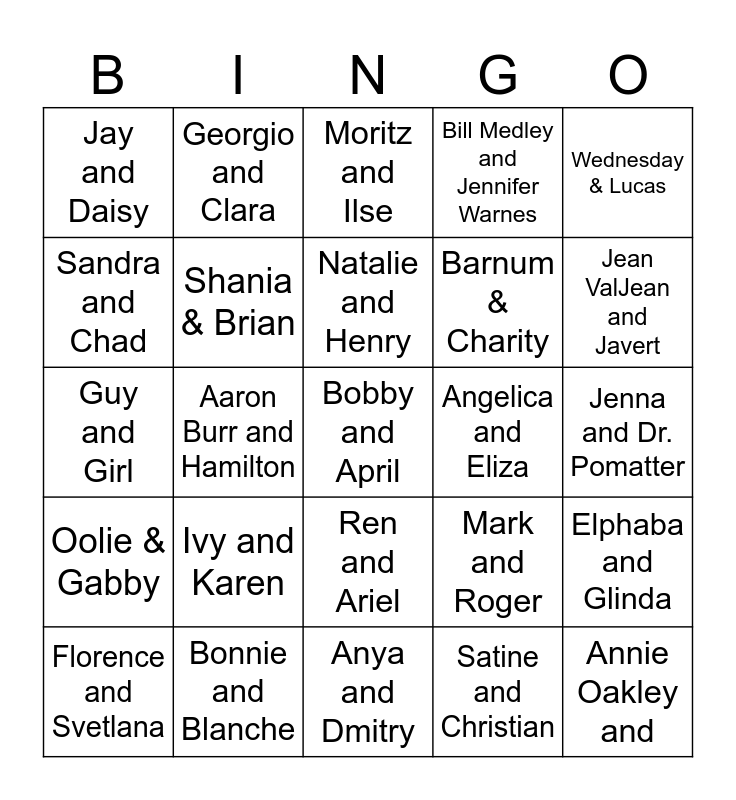 This bingo card has 75 words: Aladdin and Jasmine, Christian and Satine, Moritz and Ilse, Reno and Moonface Martin, Sonny & Cher, Irene and Cornelius, Katherine and Jack, Marvin & Whizzer, J.M. Barrie & Sylvia, Elder Price and Elder Cunningham, Annie Oakley and, Elton John and Kiki Dee, Natalie and Henry, Sandra and Chad, Cinderella and Rapunzel's Princes, Aaron Burr and Hamilton, Edna & Wilbur, Bobby and April, Peabo Bryson and Celine Dion, Wednesday & Lucas, Diana Ross and Lionel Richie, Guy and Girl, Shania & Brian, Georgio and Clara, Bill Medley and Jennifer Warnes, Johnny and June, Archie and Craven, Jason & Colbie, Curly and Laurie, Angelique & Lance, Christine and Phantom, Squeaky and Hinkley, Joe Cocker & Jennifer Warnes, Mark and Roger, Jean ValJean and Javert, Barnum & Charity, Christine and Phantom, Orpheus and Euridyce, Jenna and Dr. Pomatter, Satine and Christian, Dawn and Ogie, Linus and Sally, Tony and Maria, Zoe and Evan, Seymour and Audrey, Sweeney and Mrs. Lovett, Florence and Svetlana, Jay and Daisy, Lady Gaga and Bradley, Tony and Maria, Nina & Benny, Ren and Ariel, Elphaba and Fiyero, Tevye and Golde, Elsa and Anna, Cherry and Ponyboy, Daisy & Violet, Louise and June, Lucy & Emma, Baker and Baker's Wife, Ivy and Karen, Anna and Hans, Francesca and Robert, Roxie and Velma, Betty and Judy, Angelica and Eliza, Maureen and Joannn, Lady of the Lake and, Jonathan & Susan, Elphaba and Glinda, Oolie & Gabby, Bonnie and Blanche, Sandy and Danny, Anya and Dmitry and Lydia and Delia.
