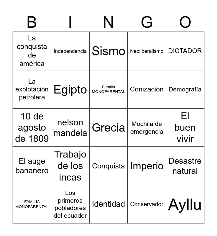 This bingo card has a free space and 24 words: FAMILIA MONOPARENTAL, Trabajo de los incas, Familia MONOPARENTAL, Conservador, DICTADOR, La conquista de américa, Independencia, Sismo, Mochila de emergencia, El buen vivir, 10 de agosto de 1809, Egipto, Imperio, Desastre natural, La explotación petrolera, Los primeros pobladores del ecuador, Identidad, Neoliberalismo, Demografía, El auge bananero, nelson mandela, Conquista, Conización and Ayllu.