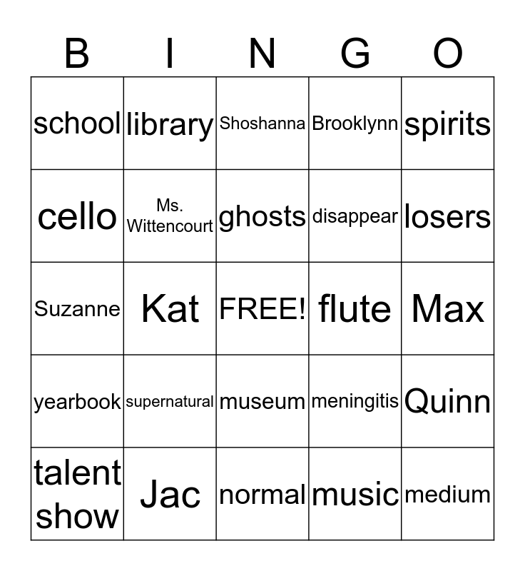 This bingo card has a free space and 24 words: supernatural, Jac, ghosts, talent show, spirits, school, cello, library, flute, museum, disappear, Suzanne, meningitis, Quinn, Ms. Wittencourt, music, Max, Shoshanna, losers, Kat, medium, yearbook, Brooklynn and normal.
