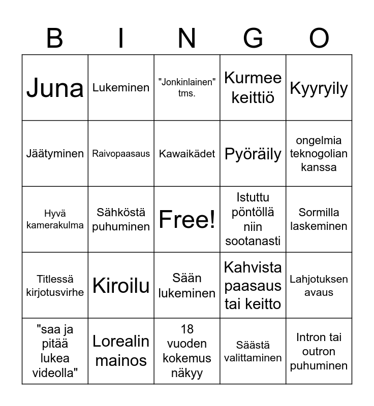 This bingo card has a free space and 26 words: Sään lukeminen, Säästä valittaminen, Kawaikädet, Lorealin mainos, Kyyryily, Juna, Jäätyminen, Lukeminen, Sormilla laskeminen, Kahvista paasaus tai keitto, Pyöräily, Hyvä kamerakulma, Lahjotuksen avaus, "saa ja pitää lukea videolla", Sähköstä puhuminen, Random artikkelin ääneenluku, Kurmee keittiö, Titlessä kirjotusvirhe, "Jonkinlainen" tms., Intron tai outron puhuminen, ongelmia teknogolian kanssa, 18 vuoden kokemus näkyy, Istuttu pöntöllä niin sootanasti, Kiroilu, Raivopaasaus and normaali paasaus.