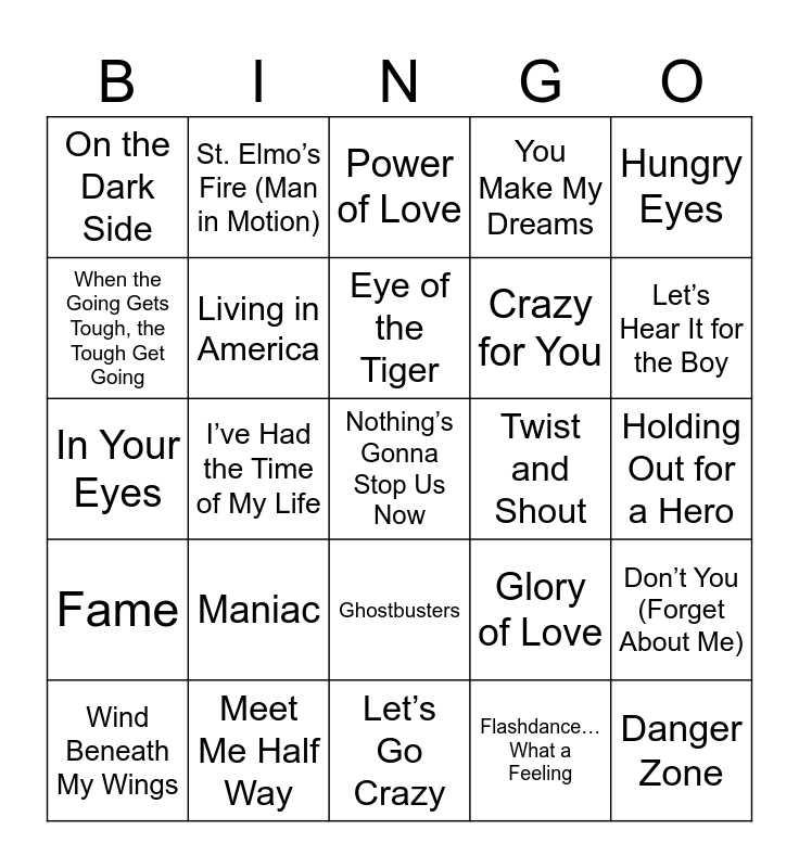This bingo card has a free space and 42 words: Free!, Eye of the Tiger, Footloose, Maniac, Flashdance… What a Feeling, Don’t You (Forget About Me), Danger Zone, Take My Breath Away, Power of Love, Ghostbusters, Holding Out for a Hero, Let’s Hear It for the Boy, I’ve Had the Time of My Life, Hungry Eyes, Cruel Summer, Glory of Love, If You Leeave, In Your Eyes, The Goonies ‘R’ Good Enough, St. Elmo’s Fire (Man in Motion), When the Going Gets Tough, the Tough Get Going, Rhythm of the Night, Shakedown, On the Dark Side, Love is a Battlefield, Miss Misery, Crazy for You, The Heat Is On, Staying Alive, I Can Dream About You, Somebody’s Baby, Fame, Living in America, Let’s Go Crazy, Purple Rain, Wind Beneath My Wings, Meet Me Half Way, Twist and Shout, Walking on Sunshine, Let My Love Open the Door, You Make My Dreams and Real Wild Child (Wild One).