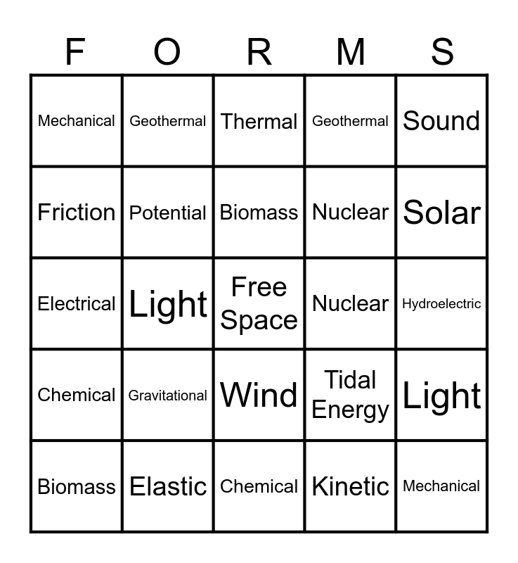 This bingo card has a free space and 41 words: Thermal, Electrical, Solar, Potential, Elastic, Wind, Biomass, Kinetic, Sound, Chemical, Light, Geothermal, Mechanical, Hydroelectric, Nuclear, Gravitational, Magnetic Energy, Mechanical, Sound, Thermal, Light, Electrical, Chemical, Nuclear, Elastic, Gravitational, Kinetic, Potential, Solar, Wind, Hydroelectric, Geothermal, Biomass, Magnetic Energy, Tidal Energy, Friction, Acoustic Energy, Radiant Energy, Piezoelectric Energy, Hydrogen Fuel and Plasma Energy.