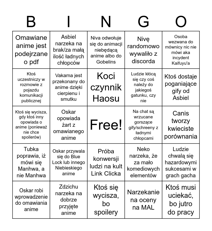 This bingo card has a free space and 24 words: Oskar przywala się do Blue Lock lub innego Niebieskiego anime, Zdzichu narzeka na dobrze przyjęte anime, Koci czynnik Haosu, Oskar robi wprowadzenie do omawiania anime, Osoba wezwana do mównicy nic nie mówi aka incydent Kaifuyu'a, Omawiane anime jest podejrzane o pdf, Ktoś uczestniczy w rozmowie z pojazdu komunikacji publicznej, Asbiel narzeka na brak/za małą ilość ładnych chłopców, Na chat są wrzucane gorszące gify/schreeny z ładnymi chłopcami, Próba konwersji ludzi na kult Link Clicka, Ludzie kłócą się czy coś należy do jakiegoś gatunku, czy nie, Ktoś się wycisza, gdy ktoś inny opowiada o anime (ponieważ nie chce spoilerów), Neko narzeka, że za mało komediowych elementów, Ludzie chwalą się hazardowymi sukcesami w grach gacha, Vakama jest przekonany do anime dzięki cierpienu i smutku, Narzekanie na oceny na MAL, Canis tworzy kwieciste porównania, Niva odwołuje się do animacji niebędącą anime albo do Gobelins, Ktoś dostaje poganiające gify od Asbiel, Oskar opowiada żart z omawianego anime, Ktoś musi uciekać, bo jutro do pracy, Tubka poprawia, iż mówi się Manhwa, a nie Manhwa, Nivę randomowo wywaliło z discorda and Ktoś się wycisza, bo spoilery.