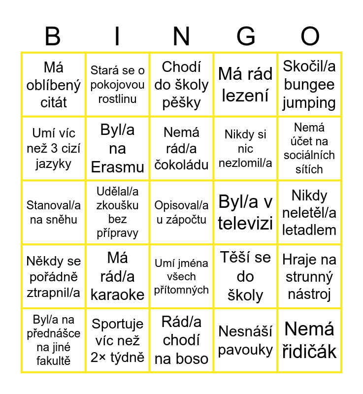 This bingo card has 35 words: Učil/a mimo VŠ, Je ráno protivný/á bez kávy, Umí zpaměti báseň, Byl/a na Erasmu, Umí jména všech přítomných, Má rád lezení, Umí víc než 3 cizí jazyky, Nemá žádné domácí zvíře, Nemá rád/a čokoládu, Byl/a v Africe, Stanoval/a na sněhu, Skočil/a bungee jumping, Jel/a v posledních 3 dnech vlakem, Má všechny zkoušky, Má oblíbený citát, Byl/a v televizi, Nesnáší pavouky, Udělal/a zkoušku bez přípravy, Někdy se pořádně ztrapnil/a, Opisoval/a u zápočtu, Těší se do školy, Byl/a na přednášce na jiné fakultě, Hraje na strunný nástroj, Sportuje víc než 2× týdně, Chodí do školy pěšky, Nemá účet na sociálních sítích, Nemá řidičák, Snaží se chodit po schodech místo výtahu, Nikdy si nic nezlomil/a, Nikdy neletěl/a letadlem, Má sbírku (čeho?), Rád/a chodí na boso, Má rád/a karaoke, Stará se o pokojovou rostlinu and Maluje, kreslí, nebo má jiného výtvarného koníčka.