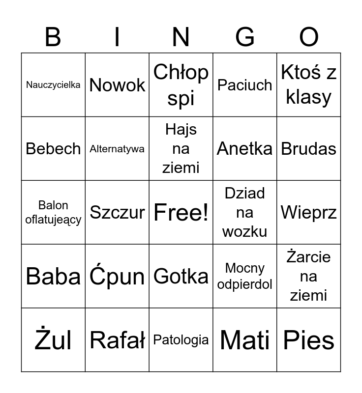 This bingo card has a free space and 24 words: Żul, Ćpun, Hajs na ziemi, Mati, Ktoś z klasy, Nauczycielka, Nowok, Chłop spi, Dziad na wozku, Wieprz, Balon oflatujeący, Alternatywa, Mocny odpierdol, Żarcie na ziemi, Bebech, Rafał, Patologia, Paciuch, Brudas, Baba, Szczur, Gotka, Anetka and Pies.