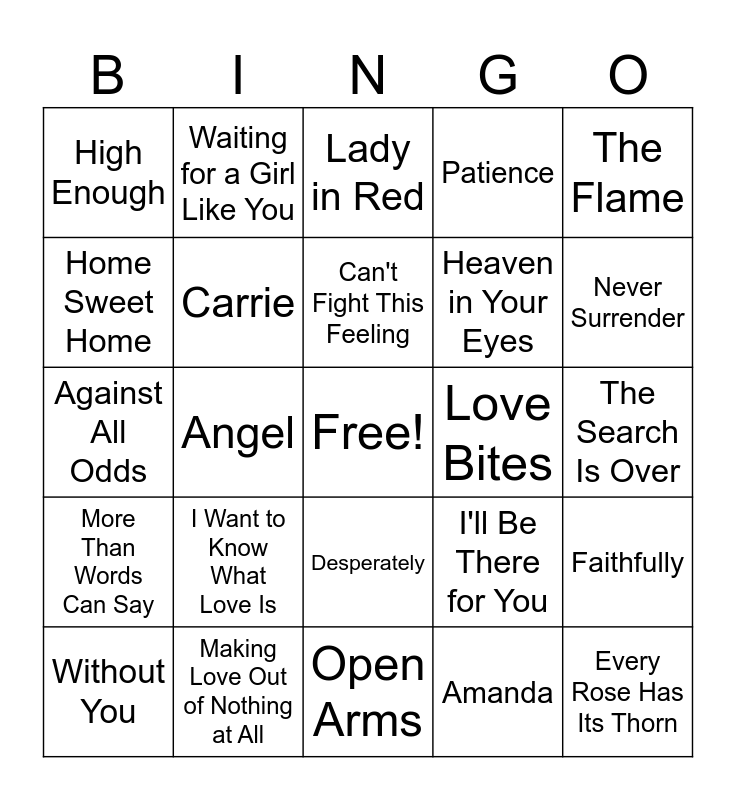 This bingo card has a free space and 47 words: Total Eclipse of the Heart, Every Rose Has Its Thorn, Alone, Open Arms, I Want to Know What Love Is, Is This Love, Waiting for a Girl Like You, Heaven, Home Sweet Home, Sara, Carrie, Patience, Faithfully, I'll Be There for You, Still Loving You, Keep On Loving You, Can't Fight This Feeling, Love Bites, When I See You Smile, The Flame, Angel, Amanda, High Enough, Heaven in Your Eyes, Don't Know What You Got (Till It's Gone), Never Surrender, Without You, I Guess Thats Why They Call It the Blues, Desperately, More Than Words Can Say, Suddenly, Love of a Lifetime, I Need You, All Out of Love, Even the Nights Are Better, Making Love Out of Nothing at All, The Search Is Over, I Drove All Night, Dont Dream Its Over, The Best of Times, Babe, Lady in Red, Against All Odds, One More Night, Hard to Say Im Sorry, You're the Inspiration and Drive.
