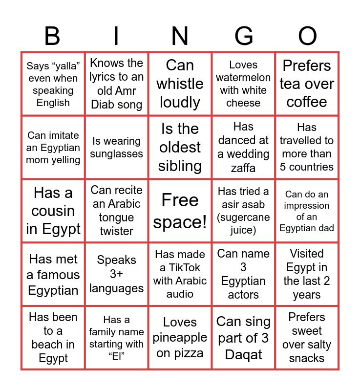 This bingo card has a free space and 24 words: Speaks 3+ languages, Has a family name starting with “El”, Is the oldest sibling, Has been to a beach in Egypt, Prefers tea over coffee, Says “yalla” even when speaking English, Can imitate an Egyptian mom yelling, Knows the lyrics to an old Amr Diab song, Has tried a asir asab (sugercane juice), Has made a TikTok with Arabic audio, Has danced at a wedding zaffa, Has a cousin in Egypt, Can name 3 Egyptian actors, Visited Egypt in the last 2 years, Is wearing sunglasses, Can sing part of 3 Daqat, Can do an impression of an Egyptian dad, Can whistle loudly, Has travelled to more than 5 countries, Can recite an Arabic tongue twister, Prefers sweet over salty snacks, Has met a famous Egyptian, Loves watermelon with white cheese and Loves pineapple on pizza.