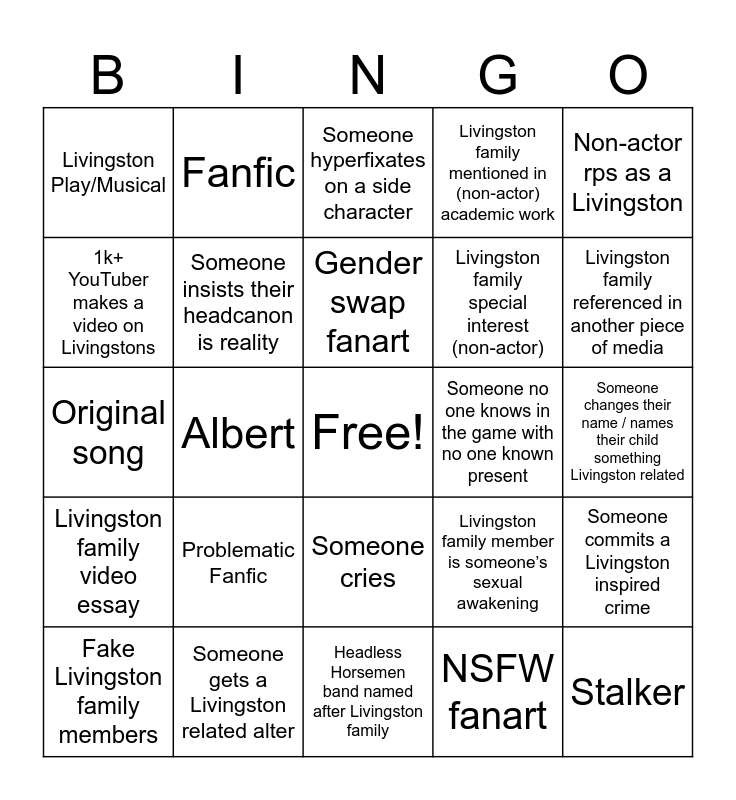 This bingo card has a free space and 24 words: Problematic Fanfic, Someone gets a Livingston related alter, Gender swap fanart, Fake Livingston family members, Non-actor rps as a Livingston, Livingston Play/Musical, 1k+ YouTuber makes a video on Livingstons, Fanfic, Someone no one knows in the game with no one known present, Someone cries, Livingston family special interest (non-actor), Original song, Livingston family member is someone’s sexual awakening, Someone commits a Livingston inspired crime, Someone insists their headcanon is reality, NSFW fanart, Someone changes their name / names their child something Livingston related, Someone hyperfixates on a side character, Livingston family referenced in another piece of media, Albert, Stalker, Livingston family video essay, Livingston family mentioned in (non-actor) academic work and Headless Horsemen band named after Livingston family.