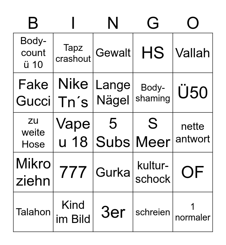 This bingo card has a free space and 24 words: 777, Kind im Bild, Lange Nägel, Talahon, Vallah, Body-count ü 10, Fake Gucci, Tapz crashout, S Meer, Gurka, Body- shaming, zu weite Hose, kultur-schock, OF, Nike Tn´s, schreien, nette antwort, Gewalt, Ü50, Vape u 18, 1 normaler, Mikro ziehn, HS and 3er.