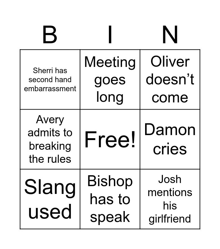 This bingo card has a free space and 8 words: Damon cries, Oliver doesn’t come, Meeting goes long, Slang used, Sherri has second hand embarrassment, Josh mentions his girlfriend, Avery admits to breaking the rules and Bishop has to speak.