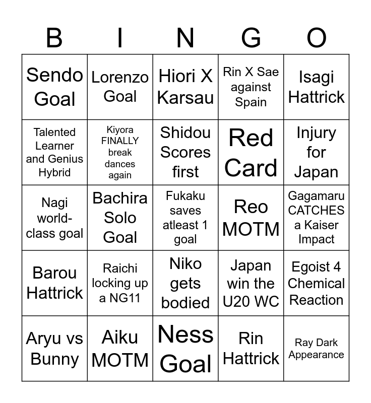 This bingo card has a free space and 24 words: Raichi locking up a NG11, Aiku MOTM, Shidou Scores first, Aryu vs Bunny, Isagi Hattrick, Sendo Goal, Talented Learner and Genius Hybrid, Lorenzo Goal, Reo MOTM, Niko gets bodied, Red Card, Nagi world-class goal, Japan win the U20 WC, Egoist 4 Chemical Reaction, Kiyora FINALLY break dances again, Rin Hattrick, Gagamaru CATCHES a Kaiser Impact, Hiori X Karsau, Injury for Japan, Bachira Solo Goal, Ray Dark Appearance, Barou Hattrick, Rin X Sae against Spain and Ness Goal.