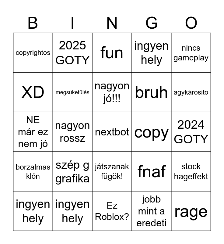 This bingo card has a free space and 31 words: Ez Roblox?, sus, nagyon rossz, mi a franc történik, copyrightos, fun, megsüketülés, fnaf, copy, jobb mint a eredeti, 2024 GOTY, rage, miért játszanál vele?, fizess hogy lélegezz, agykárosito, külföldi nyelv, stock hageffekt, szép g grafika, borzalmas klón, játszanak fügök!, nincs gameplay, 20Mil megtekintés, ingyen hely, 2025 GOTY, bruh, XD, ingyen hely, NE már ez nem jó, ingyen hely, nagyon jó!!! and ingyen hely.