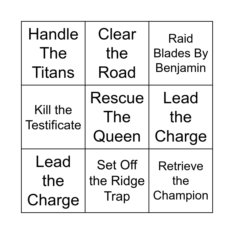 This bingo card has a free space and 8 words: Lead the Charge, Raid Blades By Benjamin, Clear the Road, Lead the Charge, Handle The Titans, Retrieve the Champion, Kill the Testificate and Set Off the Ridge Trap.