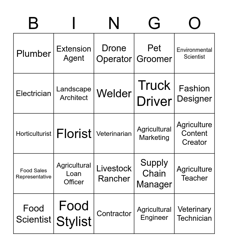 This bingo card has a free space and 32 words: Agricultural Engineer, Plant Breeder, Florist, Vineyard Manager, Food Sales Representative, Landscape Architect, Environmental Scientist, Agriculture Teacher, Extension Agent, Agricultural Software Developer, Welder, Drone Operator, Agricultural Lawyer, Agricultural Photographer, Agricultural Marketing, Chef, Food Scientist, Horticulturist, Livestock Rancher, Agricultural Loan Officer, Supply Chain Manager, Agricultural Graphic Designer, Agriculture Content Creator, Food Stylist, Veterinary Technician, Pet Groomer, Truck Driver, Electrician, Plumber, Contractor, Soil Scientist and Fashion Designer.