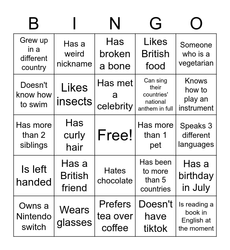 This bingo card has a free space and 24 words: Has a British friend, Wears glasses, Has met a celebrity, Owns a Nintendo switch, Someone who is a vegetarian, Grew up in a different country, Doesn't know how to swim, Has a weird nickname, Has more than 1 pet, Hates chocolate, Can sing their countries' national anthem in full, Has more than 2 siblings, Has been to more than 5 countries, Has a birthday in July, Likes insects, Doesn't have tiktok, Speaks 3 different languages, Has broken a bone, Knows how to play an instrument, Has curly hair, Is reading a book in English at the moment, Is left handed, Likes British food and Prefers tea over coffee.
