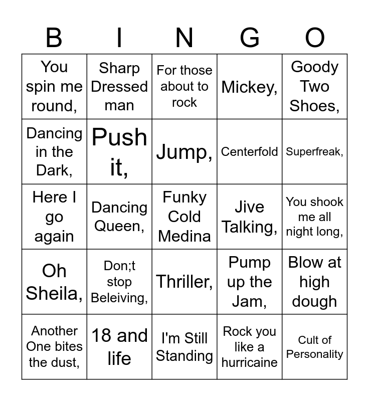 This bingo card has 39 words: Bust a move,, Bizzare love traingle,, Heart of Glass,, Push it,, Another One bites the dust,, Thriller,, Jump,, Whip It,, Goody Two Shoes,, Oh Sheila,, Dancing Queen,, Mickey,, Funky Cold Medina, You shook me all night long,, Jive Talking,, Don;t stop Beleiving,, I love rock and roll,, You spin me round,, Blue Monday,, Pump up the Jam,, Dancing in the Dark,, I'm Still Standing, Centerfold, Superfreak,, Paradise City, Crazy Train, Cult of Personality, Back in Black, She sells Sanctuary, Sharp Dressed man, You can call me Al, Enter Sandman, For those about to rock, 18 and life, Rock you like a hurricaine, New Orleans is sinking, Blow at high dough, Here I go again and The one I love.