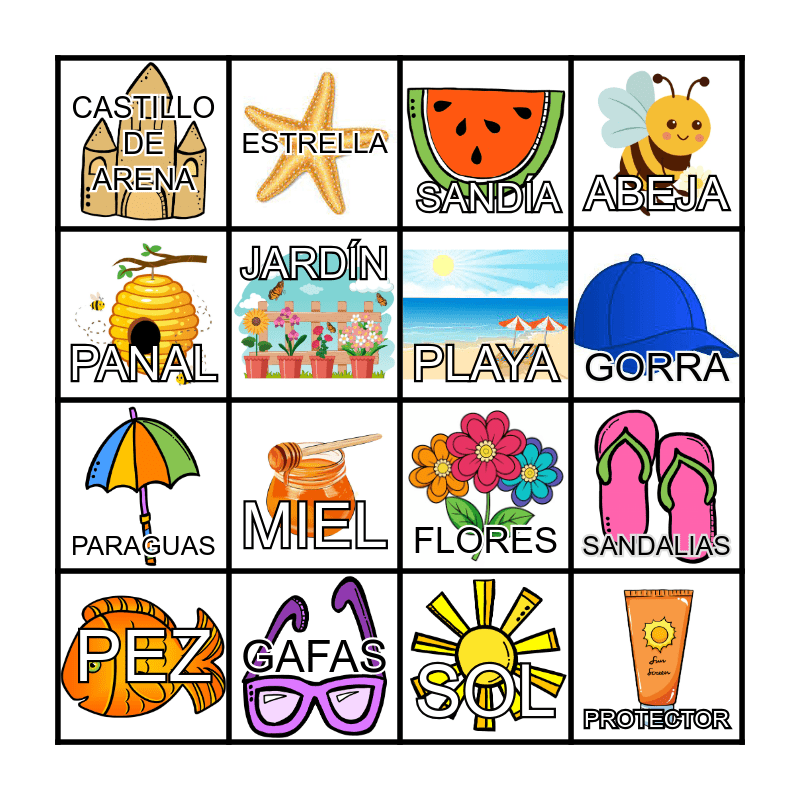 This bingo card has 16 images and 16 words: GAFAS, SANDALIAS, SANDÍA, CASTILLO DE ARENA, PARAGUAS, ESTRELLA, FLORES, SOL, PANAL, JARDÍN, PEZ, ABEJA, MIEL, GORRA, PLAYA and PROTECTOR.