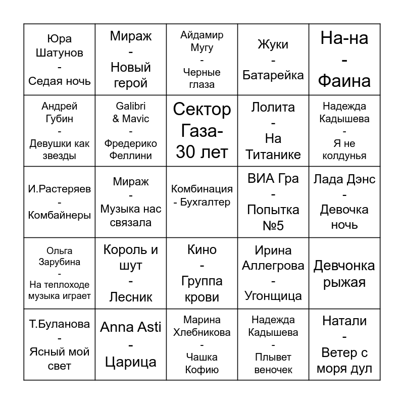 This bingo card has a free space and 24 words: Король и шут - Лесник, Anna Asti - Царица, Сектор Газа- 30 лет, Т.Буланова - Ясный мой свет, На-на - Фаина, Юра Шатунов - Седая ночь, Андрей Губин - Девушки как звезды, Мираж - Новый герой, ВИА Гра - Попытка №5, Кино - Группа крови, Лолита - На Титанике, И.Растеряев - Комбайнеры, Ирина Аллегрова - Угонщица, Девчонка рыжая, Galibri & Mavic - Фредерико Феллини, Надежда Кадышева - Плывет веночек, Лада Дэнс - Девочка ночь, Айдамир Мугу - Черные глаза, Надежда Кадышева - Я не колдунья, Мираж - Музыка нас связала, Натали - Ветер с моря дул, Ольга Зарубина - На теплоходе музыка играет, Жуки - Батарейка and Марина Хлебникова - Чашка Кофию.