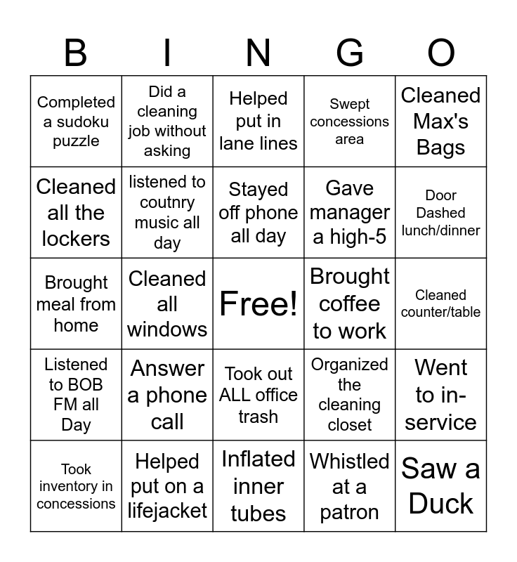 This bingo card has a free space and 24 words: Answer a phone call, Helped put on a lifejacket, Stayed off phone all day, Took inventory in concessions, Cleaned Max's Bags, Completed a sudoku puzzle, Cleaned all the lockers, Did a cleaning job without asking, Brought coffee to work, Took out ALL office trash, Gave manager a high-5, Brought meal from home, Organized the cleaning closet, Went to in-service, listened to coutnry music all day, Whistled at a patron, Cleaned counter/table, Helped put in lane lines, Door Dashed lunch/dinner, Cleaned all windows, Saw a Duck, Listened to BOB FM all Day, Swept concessions area and Inflated inner tubes.