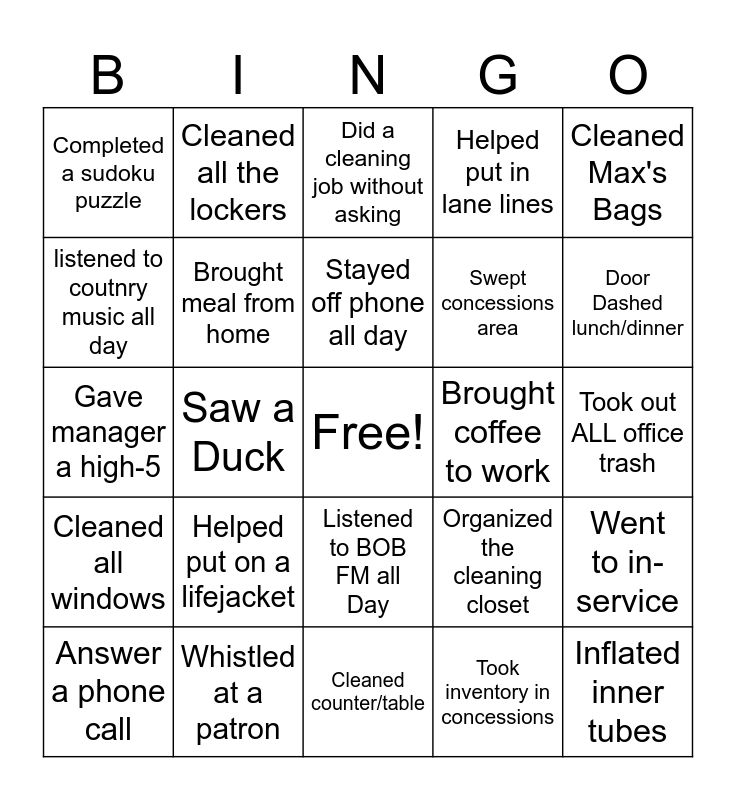 This bingo card has a free space and 24 words: Answer a phone call, Helped put on a lifejacket, Stayed off phone all day, Took inventory in concessions, Cleaned Max's Bags, Completed a sudoku puzzle, Cleaned all the lockers, Did a cleaning job without asking, Brought coffee to work, Took out ALL office trash, Gave manager a high-5, Brought meal from home, Organized the cleaning closet, Went to in-service, listened to coutnry music all day, Whistled at a patron, Cleaned counter/table, Helped put in lane lines, Door Dashed lunch/dinner, Cleaned all windows, Saw a Duck, Listened to BOB FM all Day, Swept concessions area and Inflated inner tubes.