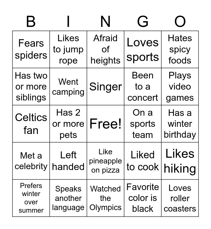 This bingo card has a free space and 24 words: Left handed, Speaks another language, Singer, Prefers winter over summer, Hates spicy foods, Fears spiders, Has two or more siblings, Likes to jump rope, On a sports team, Like pineapple on pizza, Been to a concert, Celtics fan, Liked to cook, Likes hiking, Went camping, Favorite color is black, Has a winter birthday, Afraid of heights, Plays video games, Has 2 or more pets, Loves roller coasters, Met a celebrity, Loves sports and Watched the Olympics.