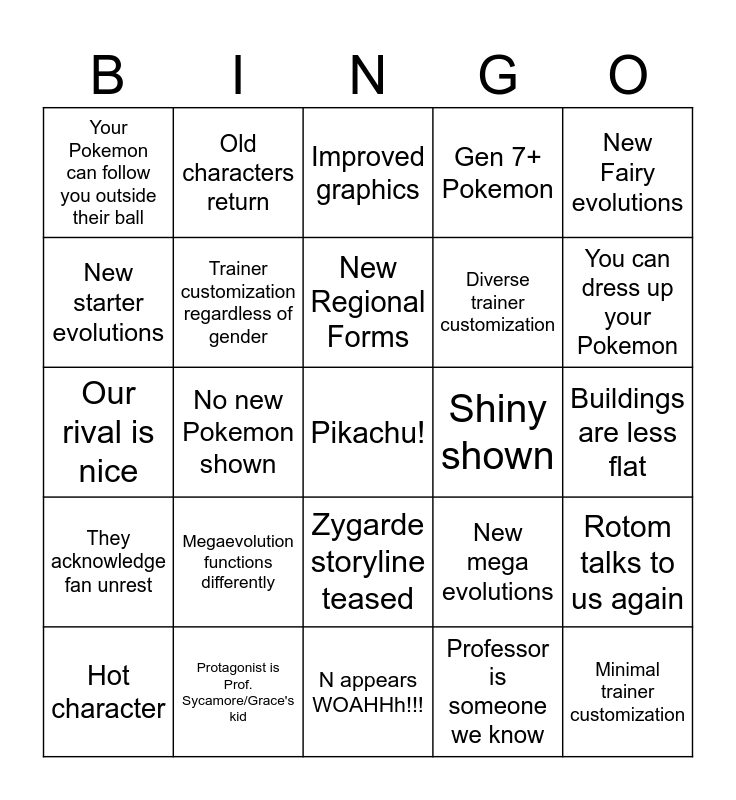 This bingo card has a free space and 24 words: Megaevolution functions differently, Protagonist is Prof. Sycamore/Grace's kid, New Regional Forms, Hot character, New Fairy evolutions, Your Pokemon can follow you outside their ball, New starter evolutions, Old characters return, Shiny shown, Zygarde storyline teased, Diverse trainer customization, Our rival is nice, New mega evolutions, Rotom talks to us again, Trainer customization regardless of gender, Professor is someone we know, Buildings are less flat, Improved graphics, You can dress up your Pokemon, No new Pokemon shown, Minimal trainer customization, They acknowledge fan unrest, Gen 7+ Pokemon and N appears WOAHHh!!!.