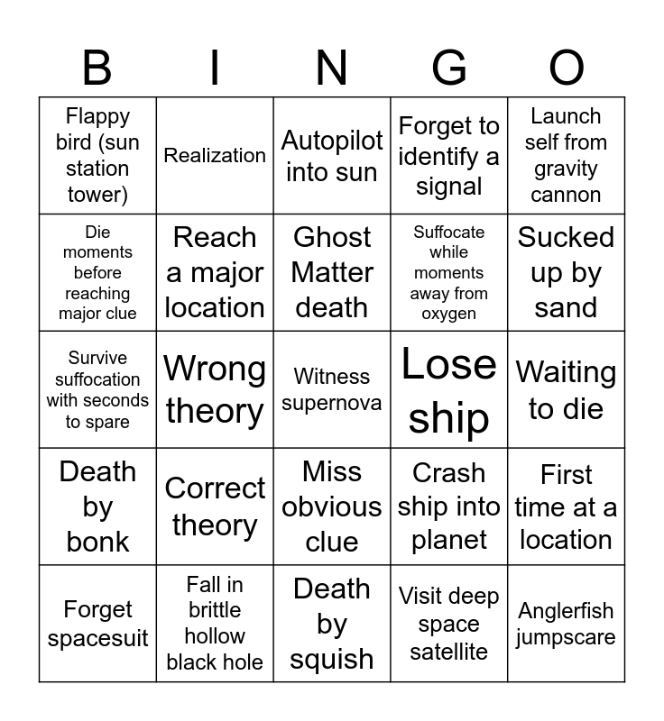 This bingo card has a free space and 29 words: Forget spacesuit, Die to supernova and not know why, Wrong theory, Chase the probe, Flappy bird (sun station tower), Autopilot into sun, Reach a major location, Correct theory, Lose ship, Fall in brittle hollow black hole, Waiting to die, Anglerfish jumpscare, Death by squish, Visit deep space satellite, Sucked up by sand, Death by zap, Miss obvious clue, Death by bonk, Launch self from gravity cannon, Survive suffocation with seconds to spare, Crash ship into planet, Death by ship explosion, Suffocate while moments away from oxygen, Die moments before reaching major clue, Forget to identify a signal, Realization, First time at a location, Ghost Matter death and Ignore the .0001 time deficit.