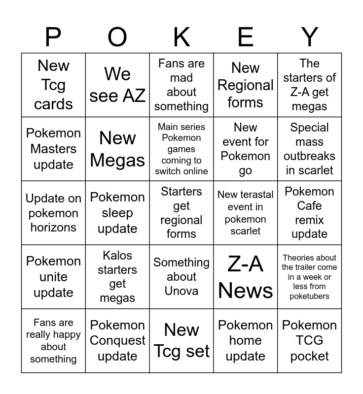 This bingo card has 25 words: Kalos starters get megas, New Tcg set, Main series Pokemon games coming to switch online, Fans are really happy about something, The starters of Z-A get megas, New Tcg cards, Pokemon Masters update, We see AZ, New terastal event in pokemon scarlet, Something about Unova, New event for Pokemon go, Update on pokemon horizons, Z-A News, Theories about the trailer come in a week or less from poketubers, New Megas, Pokemon TCG pocket, Pokemon Cafe remix update, Fans are mad about something, Special mass outbreaks in scarlet, Pokemon sleep update, Starters get regional forms, Pokemon Conquest update, Pokemon unite update, New Regional forms and Pokemon home update.