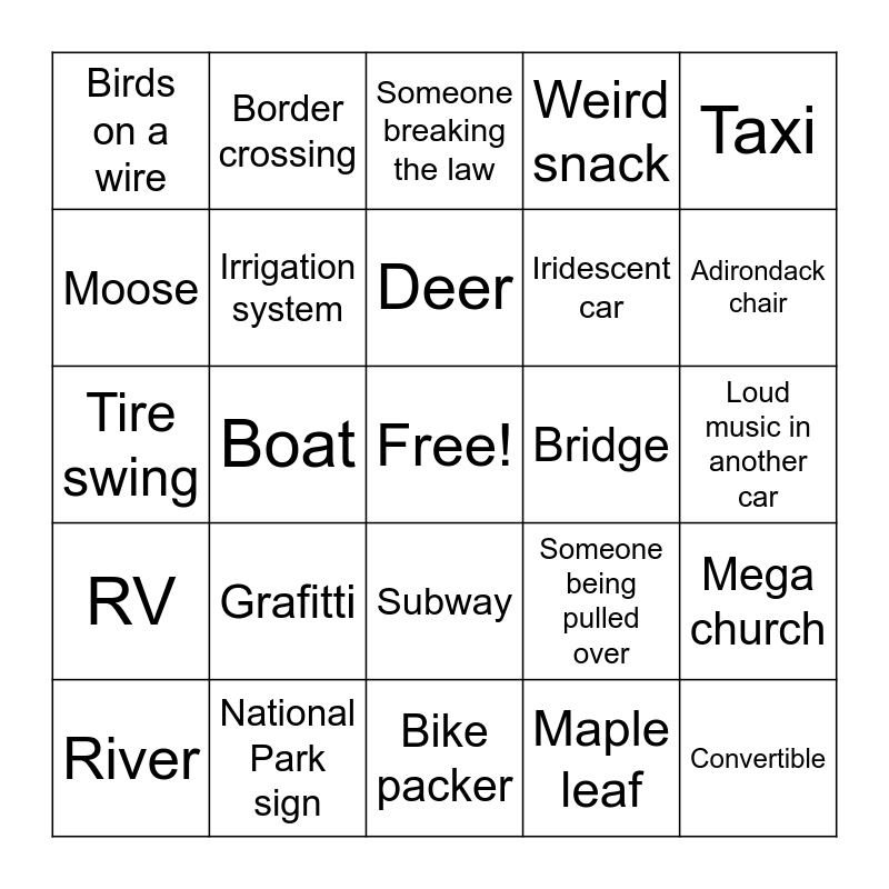 This bingo card has a free space and 24 words: Grafitti, National Park sign, Deer, River, Taxi, Birds on a wire, Moose, Border crossing, Bridge, Subway, Iridescent car, Tire swing, Someone being pulled over, Mega church, Irrigation system, Maple leaf, Loud music in another car, Someone breaking the law, Adirondack chair, Boat, Convertible, RV, Weird snack and Bike packer.