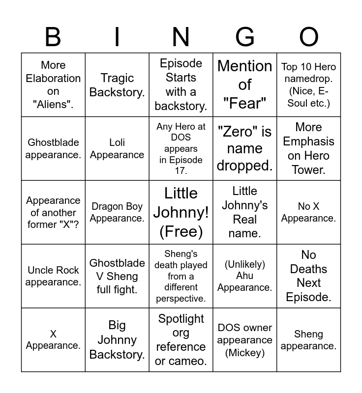 This bingo card has a free space and 24 words: Ghostblade V Sheng full fight., Big Johnny Backstory., Any Hero at DOS appears in Episode 17., X Appearance., Top 10 Hero namedrop. (Nice, E-Soul etc.), More Elaboration on "Aliens"., Ghostblade appearance., Tragic Backstory., Little Johnny's Real name., Sheng's death played from a different perspective., "Zero" is name dropped., Appearance of another former "X"?, (Unlikely) Ahu Appearance., No Deaths Next Episode., Loli Appearance, DOS owner appearance (Mickey), No X Appearance., Episode Starts with a backstory., More Emphasis on Hero Tower., Dragon Boy Appearance., Sheng appearance., Uncle Rock appearance., Mention of "Fear" and Spotlight org reference or cameo..
