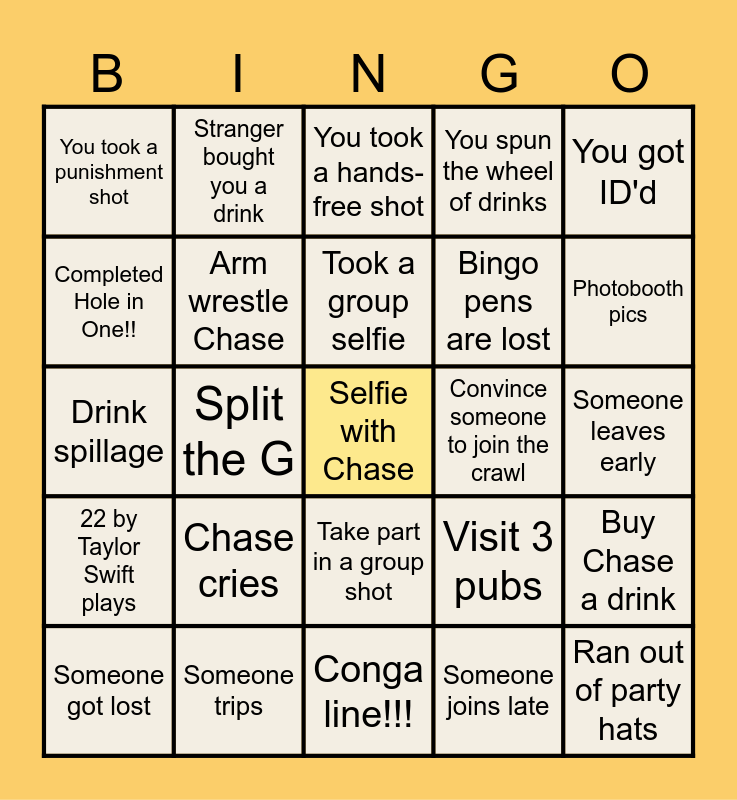 This bingo card has a free space and 24 words: Chase cries, Someone trips, Took a group selfie, Someone got lost, You got ID'd, You took a punishment shot, Completed Hole in One!!, Stranger bought you a drink, Convince someone to join the crawl, Take part in a group shot, Bingo pens are lost, Drink spillage, Visit 3 pubs, Buy Chase a drink, Arm wrestle Chase, Someone joins late, Someone leaves early, You took a hands-free shot, Photobooth pics, Split the G, Ran out of party hats, 22 by Taylor Swift plays, You spun the wheel of drinks and Conga line!!!.