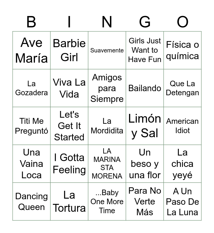 This bingo card has 100 words: Dancing in the Moonlight, Poker Face, American Idiot, Acabo de llegar, The Show Must Go On, Como Camarón, Rock & Roll, Stompa, Are You Gonna Be My Girl, Uptown Funk, La flaca, Hit The Road Jack, La Camisa Negra, La Tortura, Ghostbusters, No Quiero Verla Más, Bailando, Llença't, Bon Dia, Another One Bites The Dust, Oops!...I Did It Again, Escuela de Calor, I'm A Believer, Las de la Intuición, A Contracorriente, Limón y Sal, Física o química, Un beso y una flor, Quiero tener tu presencia, Delgadito, Let's Get It Started, Ave María, I Wanna Dance with Somebody, Despechá, Para No Verte Más, Amigos para Siempre, La chica yeyé, La Bicicleta, Hay que venir al sur, A Un Paso De La Luna, La primavera trompetera, Coti x Coti, Titi Me Preguntó, As It Was, Que La Detengan, Suavemente, Hips Don't Lie, Billie Jean, Aquí No Hay Playa, ...Baby One More Time, Like a Prayer, Mambo No. 5, Bad Romance, Por la Raja de Tu Falda, La Madre de Jose, Let's Get Loud, El Fin del Mundo, Nochentera, Don't Stop Me Now, Girls Just Want to Have Fun, LA PLATJA, Flowers, Tú Me Dejaste De Querer, Rosas, Wake Me Up, Baila Morena, Mi gran noche, Gat Rumberu, No Puedo Vivir Sin Ti, Twist And Shout, Ain't No Mountain High Enough, I Gotta Feeling, Wannabe, Felices los 4, La Despedida, La Vida Es Un Carnaval, Contando Lunares, La Gozadera, Danza Kuduro, Boom, Boom, Boom, Boom!!, Saturday Night, La Mordidita, Cuando zarpa el amor, LA MARINA STA MORENA, Un Beso Y Una Flor, Barbie Girl, COM ESTÀ EL PATI, Dos Hombres Y Un Destino, Pedro, Una Vaina Loca, Pop, Mi Carro, Da Ya Think I'm Sexy?, Dancing Queen, Viva La Vida, Torero, Como un lobo, Tractor Amarillo, Livin' la Vida Loca and Stand By Me.