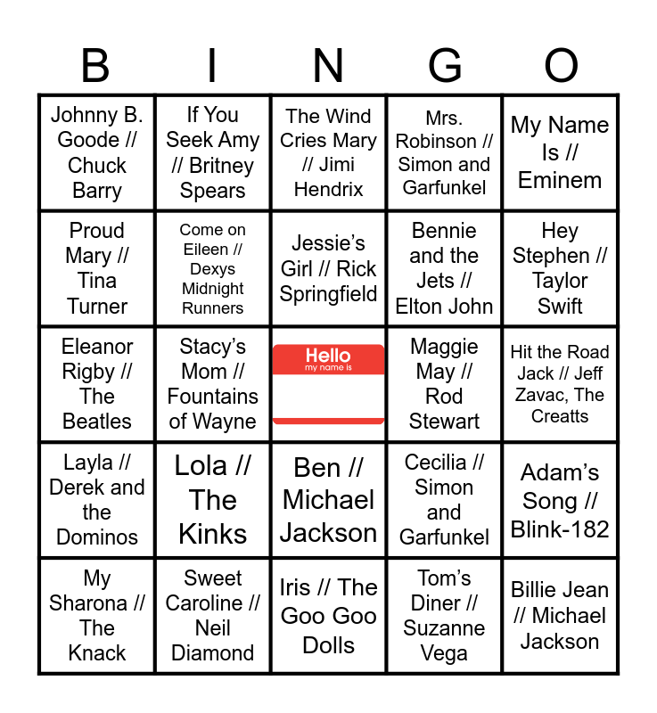 This bingo card has a free space and 32 words: Tom’s Diner // Suzanne Vega, Mrs. Jackson // Outkast, Stacy’s Mom // Fountains of Wayne, Good Golly, Miss Molly // Little Richard, Layla // Derek and the Dominos, Come on Eileen // Dexys Midnight Runners, My Name Is // Eminem, Adam’s Song // Blink-182, If You Seek Amy // Britney Spears, Valerie // Mark Ronson ft. Amy Winehouse, Jessie’s Girl // Rick Springfield, The Wind Cries Mary // Jimi Hendrix, Lucy in the Sky with Diamonds // The Beatles, Hey There Delilah // The Plain White Ts, Maggie May // Rod Stewart, Roxanne // The Police, My Sharona // The Knack, Eleanor Rigby // The Beatles, Ben // Michael Jackson, Lola // The Kinks, Cecilia // Simon and Garfunkel, Rhiannon // Fleetwood Mac, Hit the Road Jack // Jeff Zavac, The Creatts, Sweet Caroline // Neil Diamond, Billie Jean // Michael Jackson, Mrs. Robinson // Simon and Garfunkel, Bennie and the Jets // Elton John, Proud Mary // Tina Turner, Johnny B. Goode // Chuck Barry, Iris // The Goo Goo Dolls, That’s Not My Name // The Ting Tings and Hey Stephen // Taylor Swift.
