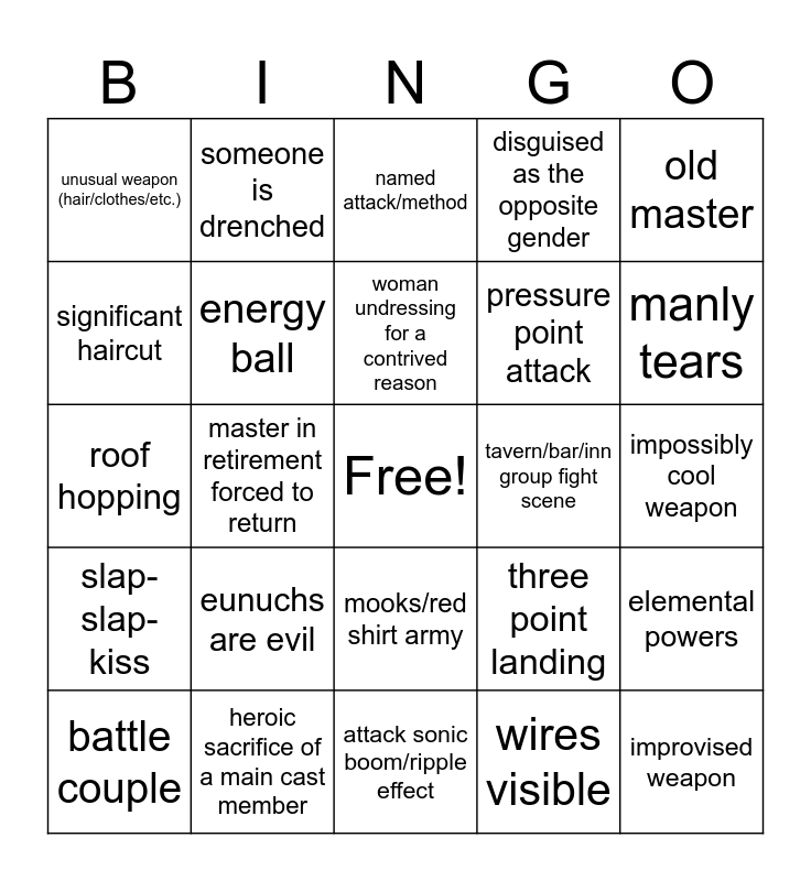 This bingo card has a free space and 29 words: battle couple, ambition is evil, master in retirement forced to return, bleeding from the mouth, unusual weapon (hair/clothes/etc.), named attack/method, energy ball, eunuchs are evil, tavern/bar/inn group fight scene, heroic sacrifice of a main cast member, impossibly cool weapon, improvised weapon, attack sonic boom/ripple effect, wires visible, manly tears, noble demon, mooks/red shirt army, slap-slap-kiss, old master, roof hopping, three point landing, "cultivation", pressure point attack, significant haircut, disguised as the opposite gender, someone is drenched, elemental powers, woman undressing for a contrived reason and evil lady tries to seduce someone.