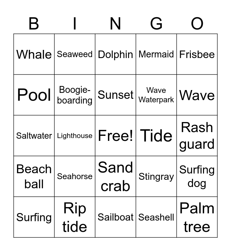This bingo card has a free space and 34 words: Sandcastle, Seashell, Sunglasses, Lifeguard, Beach ball, Boogie-boarding, Frisbee, Surfing, Seaweed, Seagull, Sunset, Dolphin, Sea turtle, Shark, Tide, Wave, Rip tide, Saltwater, Seahorse, Stingray, Sand crab, Jellyfish, Whale, Rash guard, Sailboat, Palm tree, Mermaid, Sunscreen, Wave Waterpark, Pool, Goggles, Lighthouse, Surfing dog and coral.